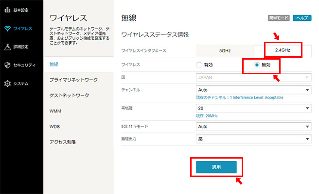 同様に2.4GHzも無効にしたいので、「2.4GHz」タブをクリックしたら「ワイヤレス」の項目を「無効」にチェックを入れます。最後に「適用」をクリックして、ルーターを再起動したら完了です。