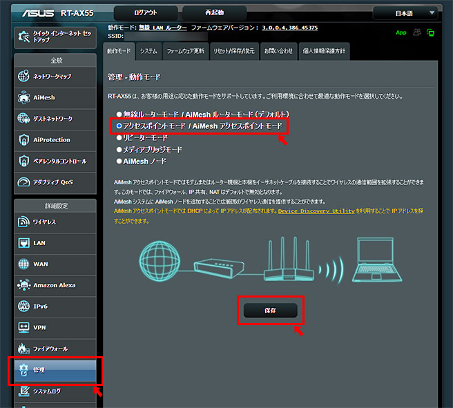 新規にユーザー名とパスワードを設定したら、RT-AX55の詳細画面が開きます。画面左のメニューから「管理」をクリックし、管理-動作モードの画面が開いたら「アクセスポイントモード」を選択して「保存」をクリックします。